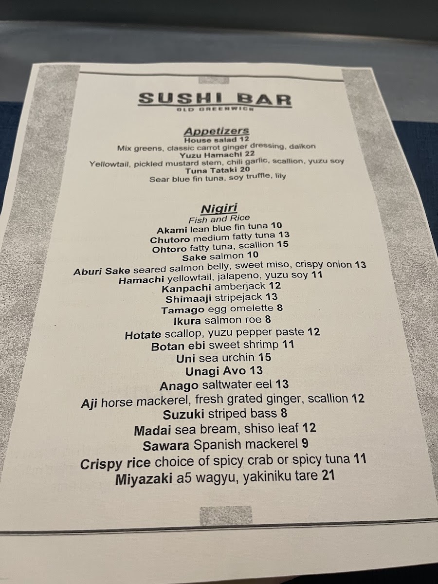 From a reviewer’s standpoint, the menu at Sushi Bar on 242 Sound Beach Ave offers a thoughtfully curated balance of classic and inventive Japanese dishes. The appetizers, including Akadashi Miso Soup, Edamame, Ginger Salad, Avocado Salad, and Gyoza, provide a light and flavorful start. For those seeking a more immersive experience, the Chef's Tasting options-Three Roll Combo, Nigiri Maki Deluxe, Salmon and Tuna Tasting, Sashimi Deluxe, and Teriyaki Salmon-showcase the kitchen’s finesse. The Classic Maki selections, like Salmon Avocado Roll, Tuna Cucumber Roll, Yellowtail Roll, Toro Takuan Roll, and Eel Roll, honor traditional sushi craftsmanship, while the Nigiri and Sashimi offerings-Aburi Sake, Mebachi, Akami, Chutoro, and Otoro-highlight premium cuts with delicate presentation. Those seeking a bolder twist can enjoy the Signature Maki such as Maguro Ebi Roll, Salmon Tsukemono, Spicy Shrimp Roll, Rainbow Roll, and Godzilla Roll, each delivering creative flavor combinations without losing authenticity. To round out the meal, the menu also offers thoughtful Add-ons like Sharkskin Grated Wasabi and a simple Rice Bowl for customization. Overall, the menu’s range-from appetizers to signature rolls-demonstrates a careful blend of tradition and innovation, making it appealing to both sushi purists and adventurous diners alike.